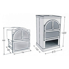 Духовой шкаф оснащен противнями и решетками для размещения в духовке на трех уровнях. Также печь снабжена полками-столешницами для установки на передней и одной из ее боковых сторон.