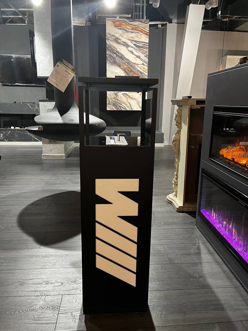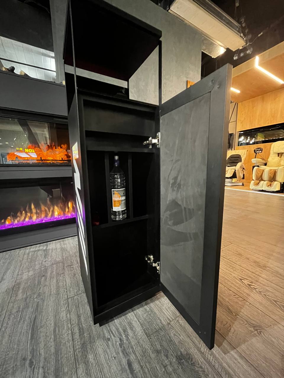 Уникальный биокамин – Firezo M Performance отражает стиль и дизайн немецкого автомобиля. Металлический каркас и стенки из дерева гармонично сочетаются с накладками из эко кожи и алькантары. Также внутри камина мы сделали мини бар – это точно удивит!