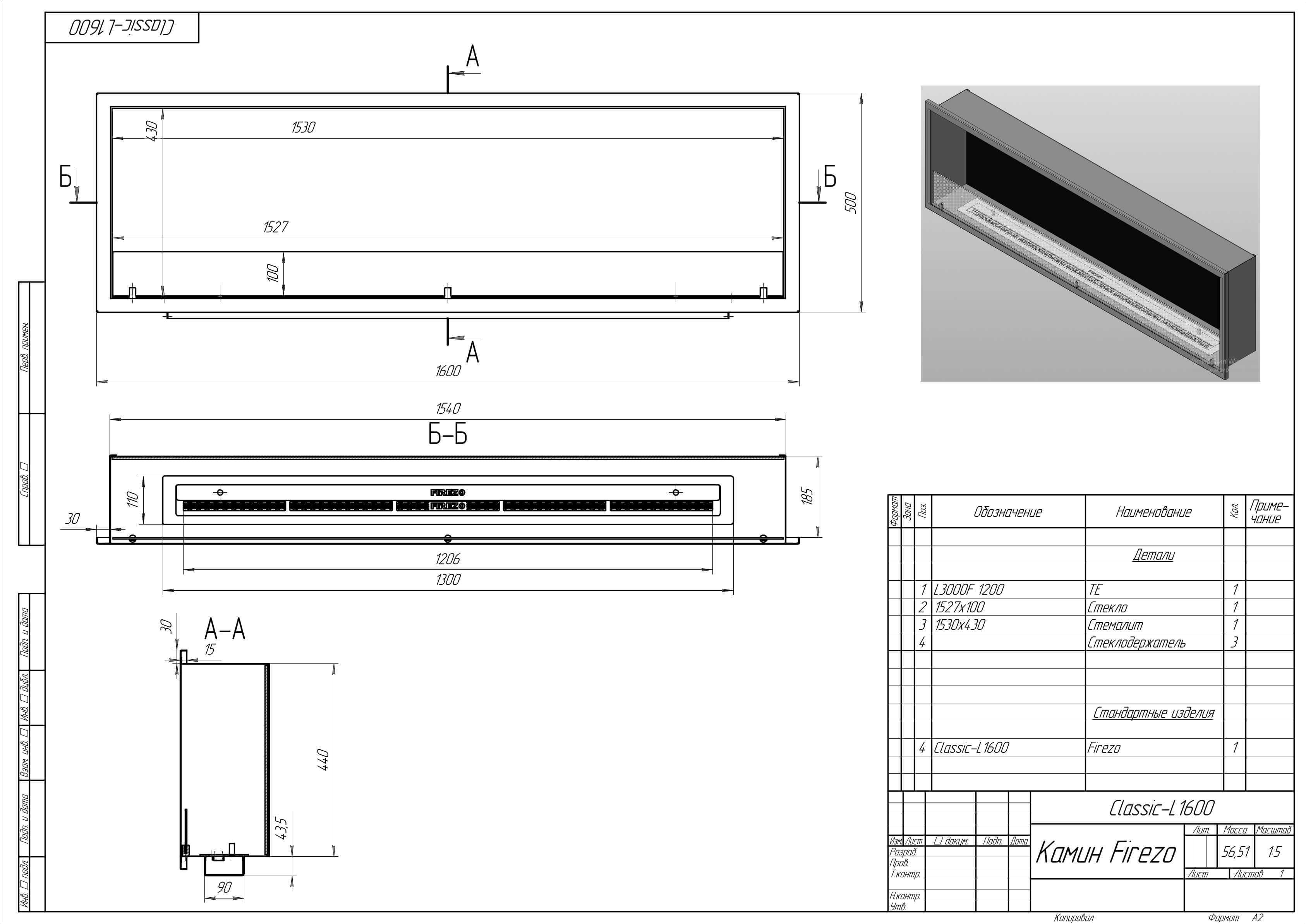 - Базовые размеры камина: 1600x200x450 мм