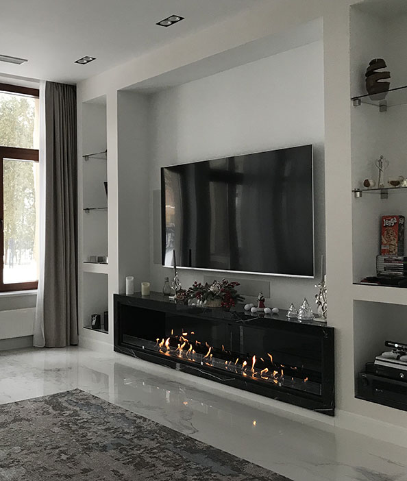 Очень удобное решение для встраивания биокамина в нишу. Можно добавить любой портал или лаконичную контурную рамку.