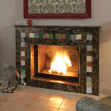 Этот камин прекрасно подойдет к интерьерам в стиле модерн. В зависимости от выбора цвета и рисунка основного камня портала и подбора оттенков мозаики он отлично впишется и в интерьер стиля минимализм, и в становящийся сегодня снова популярным стиль поп-арт. А в оттенках черного, белого и серого такой каминный портал станет настоящей находкой для стиля хай-тек.