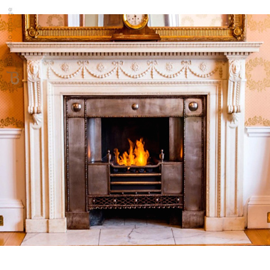 Встроенный в стену орнаментальный очаг имитирует кованое железо.