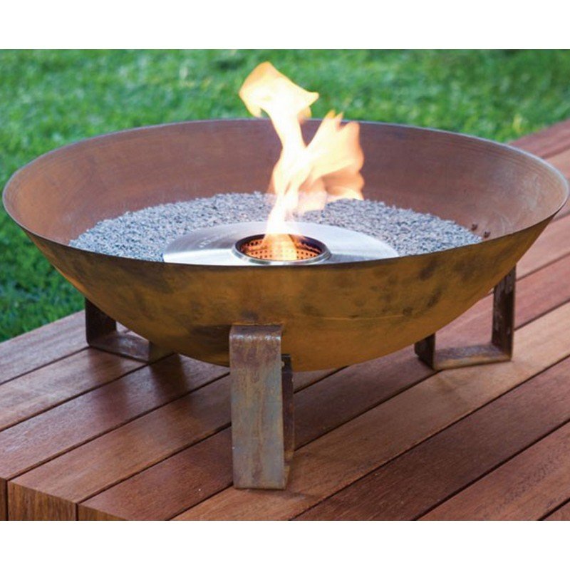 Блюдоподобный переносной биокамин ECOSMART FIRE DISH BLACK/CORETEN создаст теплую атмосферу у костра без искр и копоти во дворе, на балконе палубы, на брусчатке у открытого бассейна.