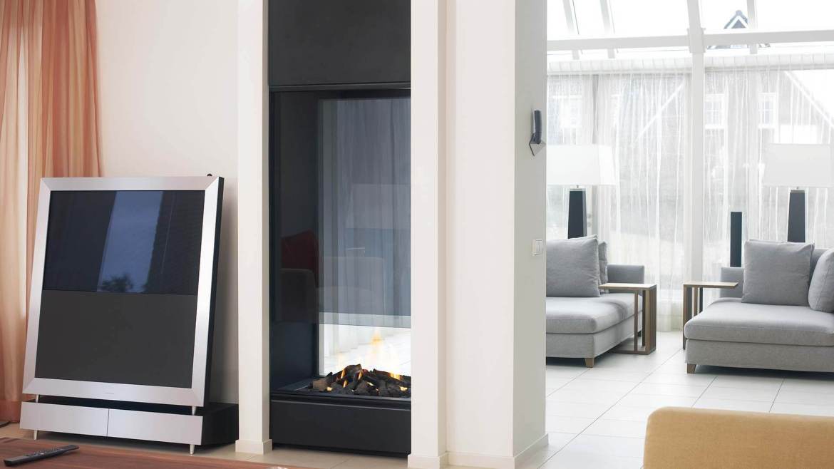 Газовая каминная топка Boley 850 в современном хай-тек стиле. Встраиваемая (сквозная) модель. С помощью двухстороннего камина вы легко превратите скучную разделительную стену в любопытное украшение интерьера.
