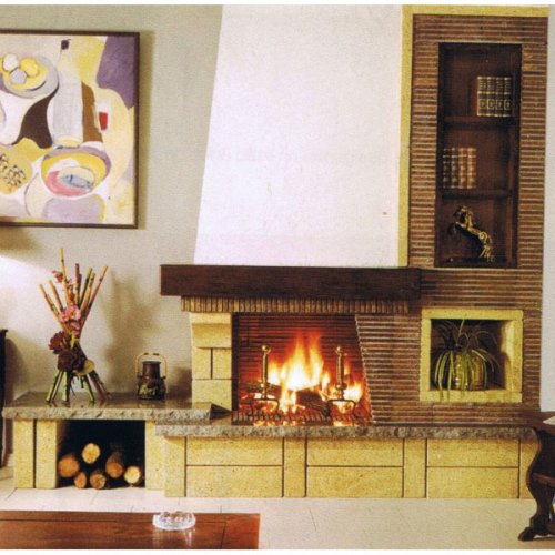 Оригинальная форма камина SE_Beret от французской компании Аксис привлекает внимание с первого взгляда. Внушительная пристенная модель, в оформлении которой используется серый природный камень и кирпич, выполнена в стиле рустик. Имеет банкетку, встроенный дровник и открытые полки, на которых Вы можете расположить любимые книги, статуэтки или памятные вещи. В комплект не входит каминная топка.