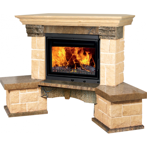 Строгие выдержанные линии камина Bella Italia Elizaveta, выполненного в светлых, пастельных тонах, прекрасно гармонируют с любыми интерьерными стилями. Широкий подиум облицовки и вертикальные боковины изготовлены из колотого мрамора Sunny Yellow желтоватого оттенка, так эффектно сочетающегося с золотистой игрой живого пламени. Горизонтальные «прослойки» и декоративные вставки изготовлены из полированного камня Rainforest Brown темных, коричневых тонов с естественными витиеватыми прожилками. В качестве обязательных элементов кантри направления присутствуют верхняя балка из светлого дуба и эффектно декорированная дровяная арка.