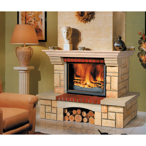 Бюджетная облицовка Bella Italia Marta выполнена в стиле прованс из золотисто-песчаного кварцевого песчаника, топка контрастно обрамлена красно-терракотовым клинкером узкого формата. Основная масса камина сложена из разноформатных колотых блоков. Детали: профилированный карниз, арочка над нишей для дров и плита подиума тщательно отшлифованы, благодаря чему камень приобретает более светлый оттенок. Завершает композицию широкая дубовая каминная полка-карниз.