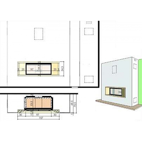 Широкая модель встроенного камина с большим горизонтальным стеклом. Каминная рамка выполнена из камня.