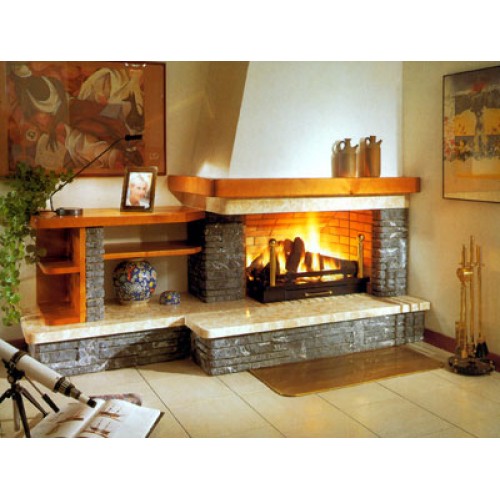 Угловой камин, укладка лозете, черный мрамор. Плита и консоль из полированного Crema Marfil. Топка из кирпича, открытая сбоку.