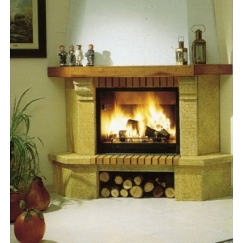 Угловой камин серии Stylo из Гарского камня. Плита и консоль из огнеупорного кирпича толщиной 5 см. Ниша для дров и деревянная балка. Металлическая топка 904, колосник и зольник.
