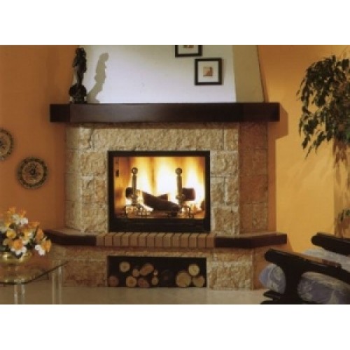 Угловой камин серии Stylo из красного мрамора Rosso Forte грубой обработки без шва. Плита из огнеупорного кирпича толщиной 5 см. Ниша для дров. Деревянные балка и канты боковых плит. Металлическая топка 904, колосник и зольник.