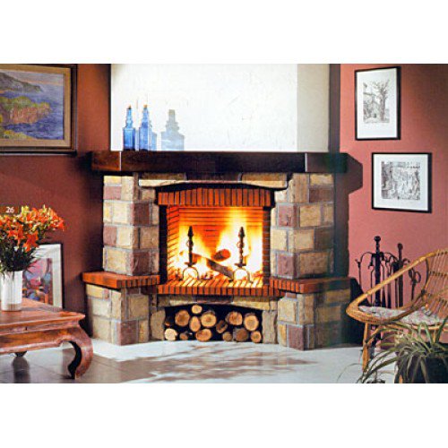 Угловой камин из натурального белого камня и красного Rojo Valles. Плита из обожженного кирпича 3 см толщиной. Деревянная балка из Iroko. Кирпичная топка из обожженного кирпича толщиной 3 см.