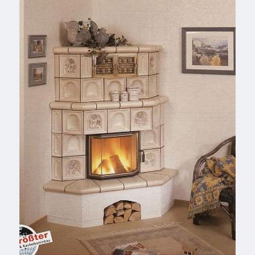 Угловой камин Hark 3/17.2 из изразцов антично-кремового цвета. В комплект облицовки входят опорная рамка с крепежами, лента, клей, DVD с инструкцией по установке, бетонный цоколь  (если предусмотрен), и шамотный короб с проматом (если короб конструкционно входит в облицовку). В комплект не входят дымоотводные трубы, промат для изоляции стен, гофра для подвода воздуха под облицовку. Решётки поставляются опционно.