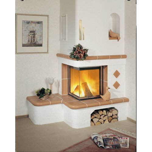Пристенно-угловой камин Hark 3/5.0 из изразцов цвета cotto hell. В комплект облицовки входят опорная рамка с крепежами, лента, клей, DVD с инструкцией по установке, бетонный цоколь  (если предусмотрен), и шамотный короб с проматом (если короб конструкционно входит в облицовку). В комплект не входят дымоотводные трубы, промат для изоляции стен, гофра для подвода воздуха под облицовку. Решётки поставляются опционно.
