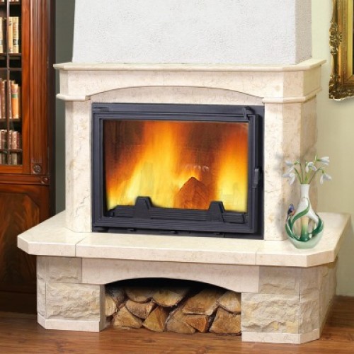 Madeira Tamiza выполнена из натурального камня: мрамор Sunny Yellow и Breccia. Вариант пристенный или угловой. Подходят под эту облицовку топки шириной до 700 мм с прямым стеклом.