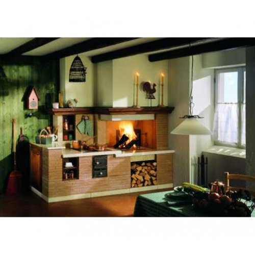 Угловой камин из кирпичей Palazzetti Friuli, обработанных вручную. Столелешница из полированного мрамора Giallo dIstria. Дровяная печь из стали и чугуна.