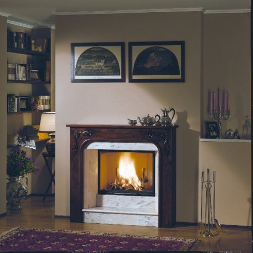 Полувстроенный каминный портал из массива инкрустированного ореха. Столешница и вставки из полированного мрамора Rosa Portogallo.