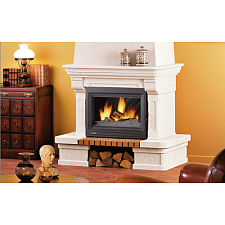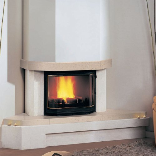 Каминная облицовка из камня Blanche и St Roch. Топка с призматичным стеклом. Для топки используются дрова.