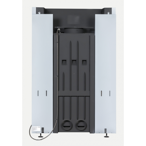 Высокий дымосборник обеспечивает дополнительный дожиг дымовых газов, что повышает КПД топки и теплоотдачу. За счет стеклокерамики и герметичности обогрев происходит в три раза выше, чем в открытом очаге. С помощью системы «чистое стекло» осуществляется полный обзор огня.