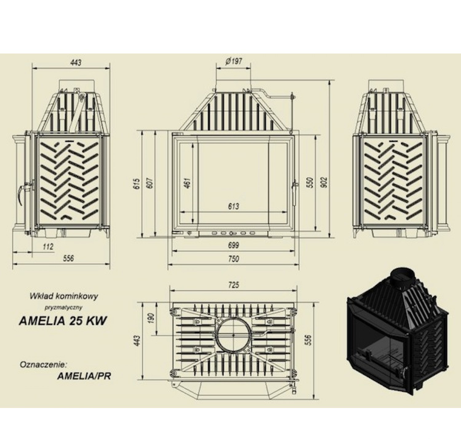 Amelia PR(призма)— топочная камера или топка-вкладыш, предназначена для отопления дома площадью до250 кв.м. Корпус данной топки выполнен из чугуна— материала имеющего хорошие эксплуатационные характеристики. Топка большой мощности ишироким стеклом призматической формы Amelia PRнесомненно станет главным акцентом винтерьере загородного дома или дачи. Выпуклая форма стекла (призматическая) создает ощущение объемного огня, притягивая взгляд. Особенности оборудования серии Amelia РRотKRATKI: Чугунная топка непрерывного сгорания; Топка высокой мощности, предназначена для больших помещений; Топка спризматическим стеклом; Теплоемкость прибора увеличивают ребра повсему корпусу; Топливо— сухие дрова длиной до500 мм; Стекло— термостойкая стеклокерамика, предел нагрева 800 С; Полная герметичность дверцы; Система «двойного дожига»; Топка имеет съемную ручку надверце; Прозрачность стекла обеспечивает система встроенного обдува; Предусмотрен держатель дров— непозволяет рассыпаться при открытии дверцы; Дно топочной камеры имеет отверстие для золы.