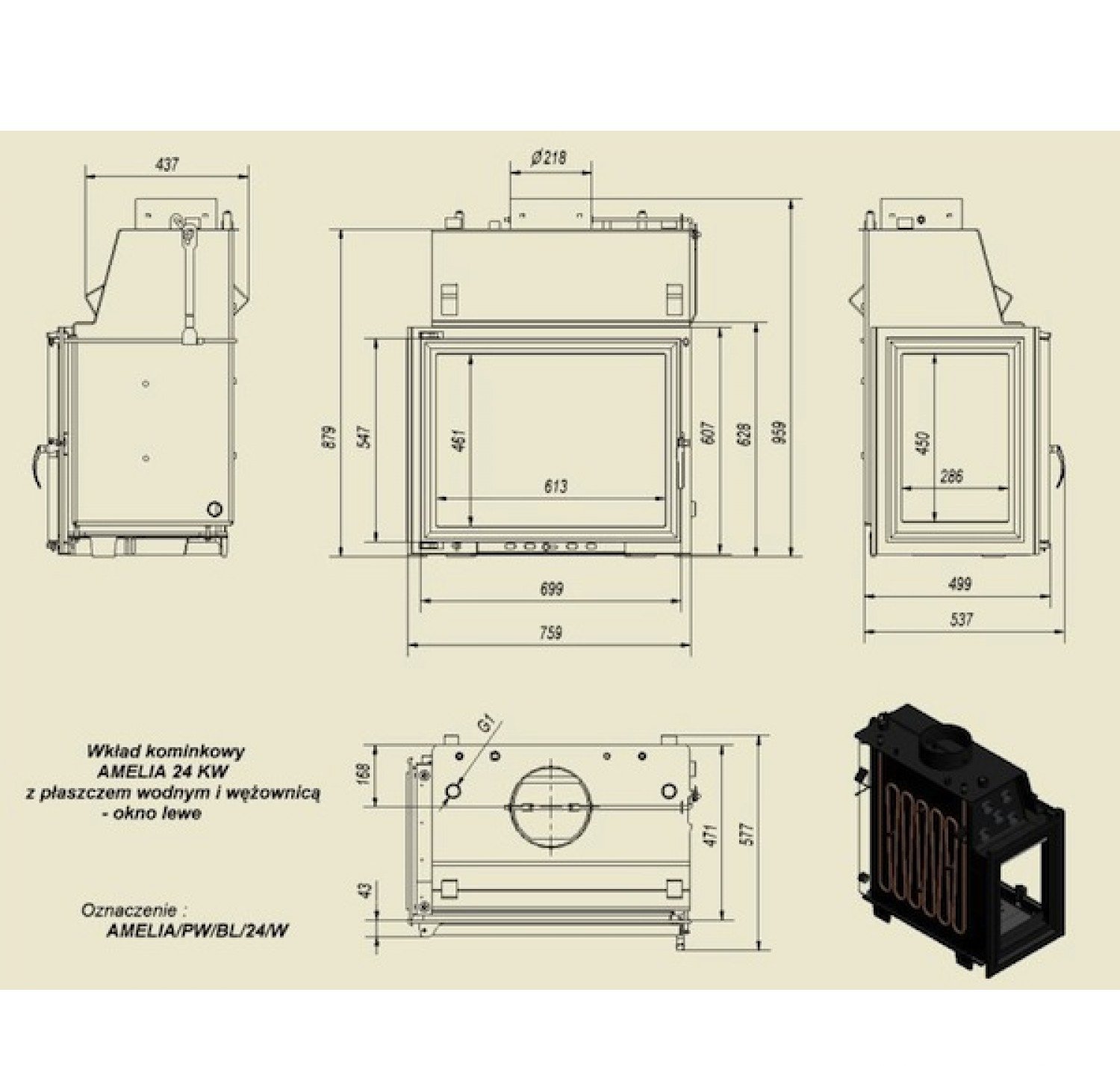 Amelia PW/BL/24/W/Z (стекло слева, змеевик)— топочная камера или топка-вкладыш, предназначена для отопления дома площадью до250 кв.м. Большая топка, которая дает много тепла ипредоставляет прекрасный обзор пламени, благодаря дополнительному боковому стеклу. Особенности оборудования серии Amelia PW/BL/24/W/Z отKRATKI: Топка высокой мощности, предназначена для больших помещений; Угловое остекление; Чугунная топка непрерывного сгорания с водяным теплообменником; Мощность теплообменника 24 кВт, объем— 57 литров; Топка с водяным теплообменником изготавливается изнелегированной листовой стали специальных сортов; в камере сгорания расположены дымоградные трубы увеличивающие поверхность теплообмена втопке; Дополнительно предусмотрен медный змеевик; Топливо— сухие дрова длиной до500 мм, уголь вбрикетах; Стекло— термостойкая стеклокерамика, предел нагрева 800 С; Высокий дымосборник, наличие шибера; Полная герметичность дверцы; Топка имеет съемную ручку надверце; Прозрачность стекла обеспечивает система встроенного обдува; Предусмотрен держатель дров— непозволяет рассыпаться при открытии дверцы; Накорпусе топки предусмотрены специальные ручки, предназначенные для удобства транспортировки; Дно топочной камеры имеет отверстие для золы.