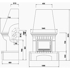 Стальная топка с прямым стеклом. Боковое открывание двери. Ширина дверки 656 мм, высота - 488 мм. Возможно подключение воздуха из-вне.