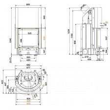 Стальная топка со сферическим стеклом. Подъёмная дверца (система Easy-Lift). Горизонтальное открывание двери для чистки стекла. Ширина дверки 616 мм, высота - 486 мм. Возможно подключение воздуха из-вне.