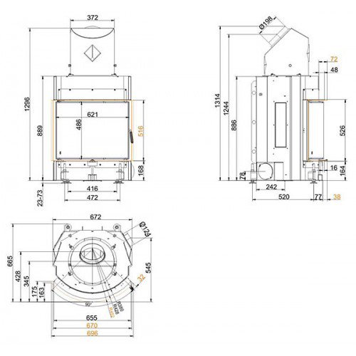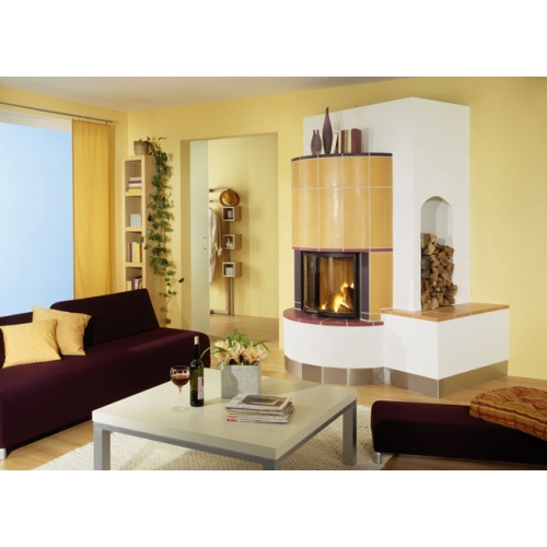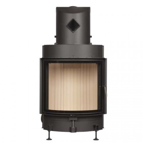 Стальная топка со сферическим стеклом. Боковое открывание двери. Ширина дверки 529 мм, высота - 546 мм. Возможно подключение воздуха из-вне.
