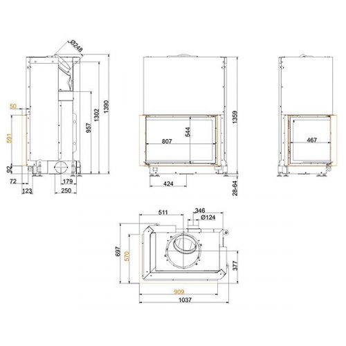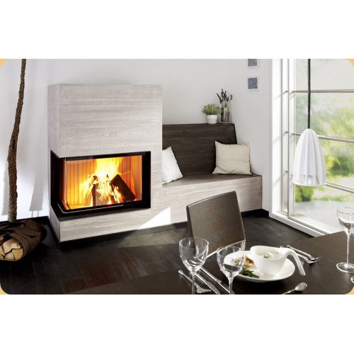 Угловая каминная топка с цельным Г-образным стеклом. Боковое стекло слева. Дверца с подъемным механизмом (система Easy-Lift). Топочная камера футерована шамотом. Ширина дверки 807/467мм, высота - 544 мм. Возможно подключение воздуха из-вне.
