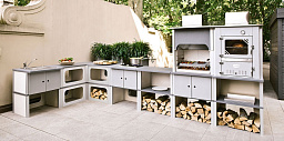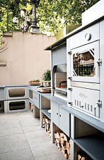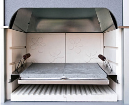 Оснащена оригинальными распашными дверцами с огнеупорным керамическим стеклом.