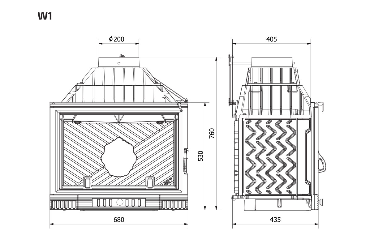 Каминная топка W1-18 кВт является классической топкой премиум класса производимой заводом KAWMET многие годы, топка выполнена из толстого чугуна класса EN-GJL- 200 и оборудована подводом наружного воздуха в камеру сгорания, встроенным шибером для регулировки процесса горения и дымоотведения, и более точной регулировкой подачи воздуха через нижнюю часть дверцы под колосниковую решетку, открыв ее на максимум, вы подаете к дровам оптимальное количество воздуха для быстрого розжига.