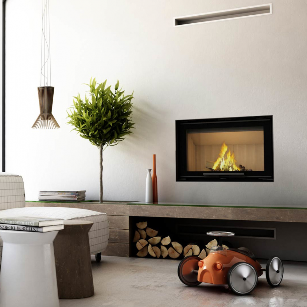 • Двойная система открывания дверец вверх (ГИЛЬОТИНА) и в сторону. Дверцы, которые поднимаются и опускаются, облегчают загрузку древесины, а боковой механизм открывания позволяет легче чистить стеклянные панели.