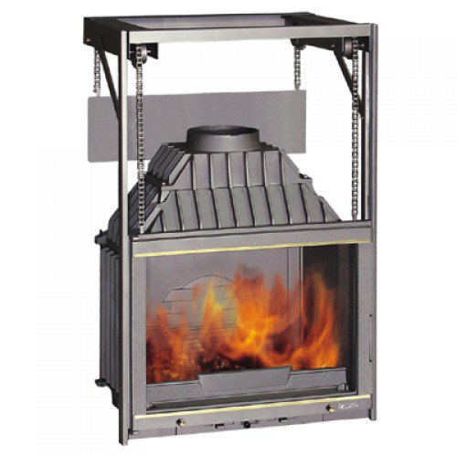 Чугунная топка для камина с увеличенным обзором огня. Вертикальное и боковое открывание, система подъема двери при помощи контргруза.