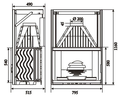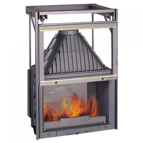 Чугунная топка с увеличенным обзором огня. Вертикальное и боковое открывание, система подъема двери при помощи контргруза.