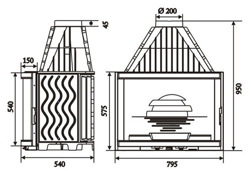 КПД топок Laudel очень высокое, мощность топок в среднем 14-16 кВт, 1кВт может обогреть 30 м3, либо 10 м2 в обычном режиме работы топки.)