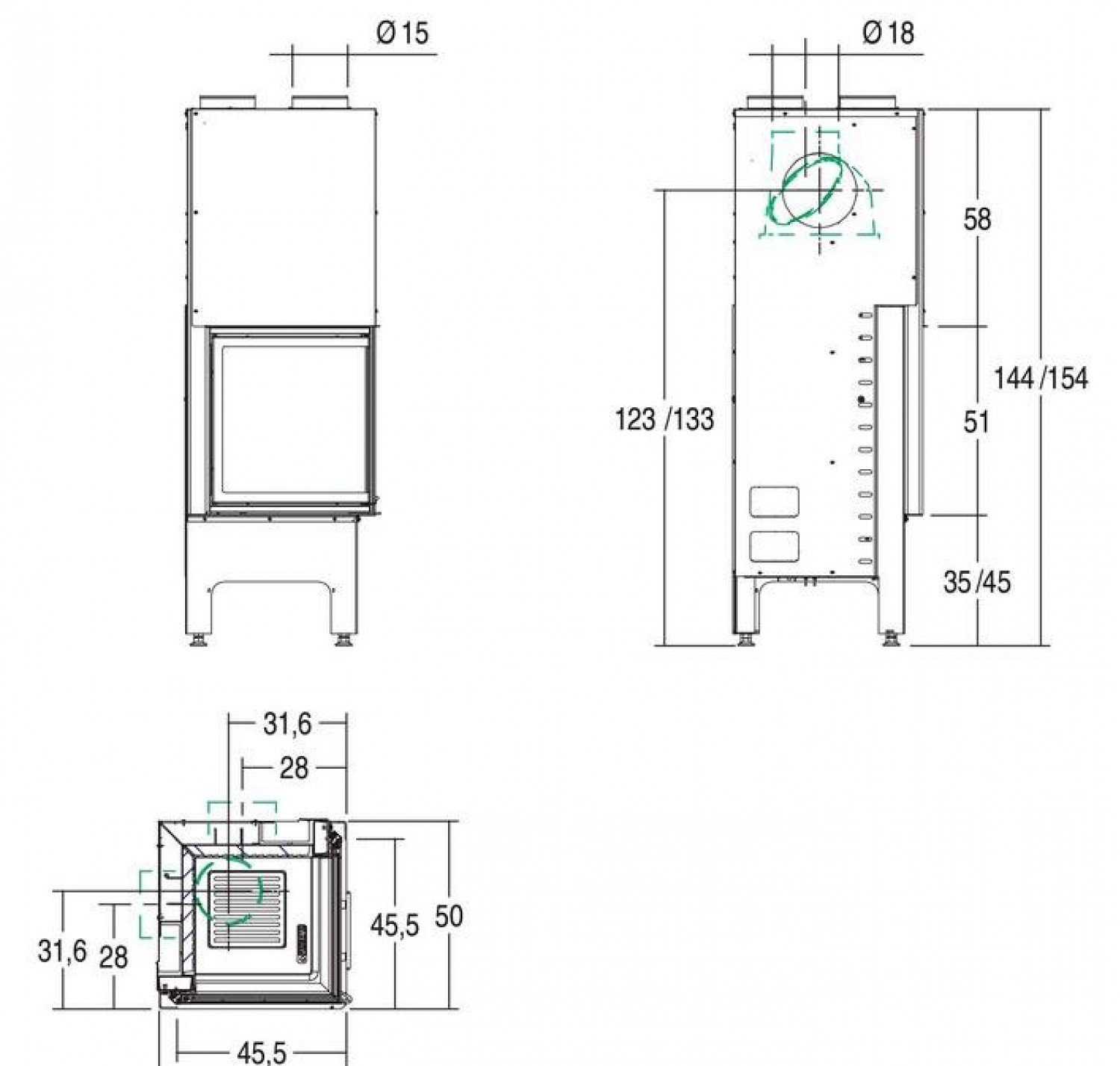 Высокий дымосборник, большой съемный зольник. Легкое обслуживание. Очаг с внутренними стенками из шамотного камня защищен керамическим стеклом, выдерживающим температуру до 750 градусов. Возможность эксплуатации с открытым очагом. Высокая производительность. Топка оснащена системой вторичного дожига и функцией самоочистки стекла. В качестве топлива используются дрова.