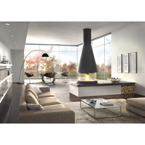 Круглый очаг, подъемная дверца с автоматической системой подъема и опусканий, панорамное стекло 360°.