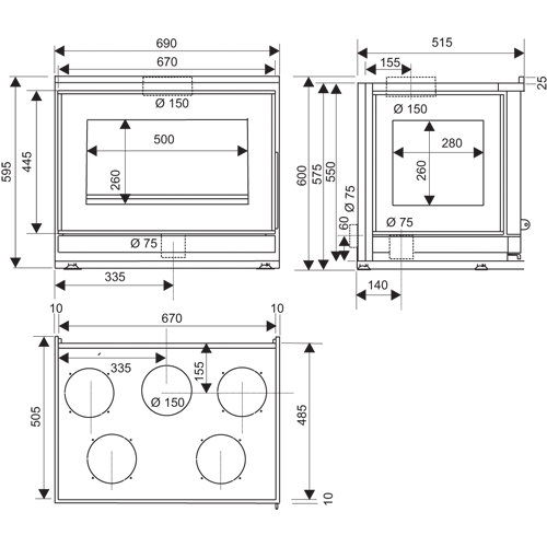 •     Топка с трехсторонним видом на огонь, 3 стекла: на фасаде + справа и слева