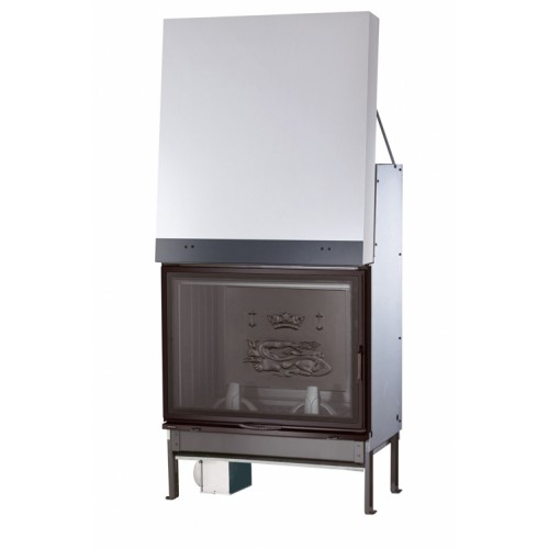 Стальная топка для пристенного камина. Очаг выполнен из толстого чугуна. Прямая дверца с декоративной рамкой. Дверца открывается, как в сторону, так и вверх. Увеличенный дымосборник.