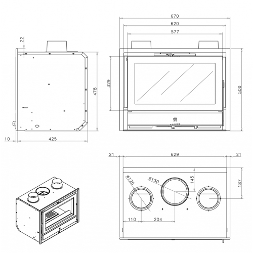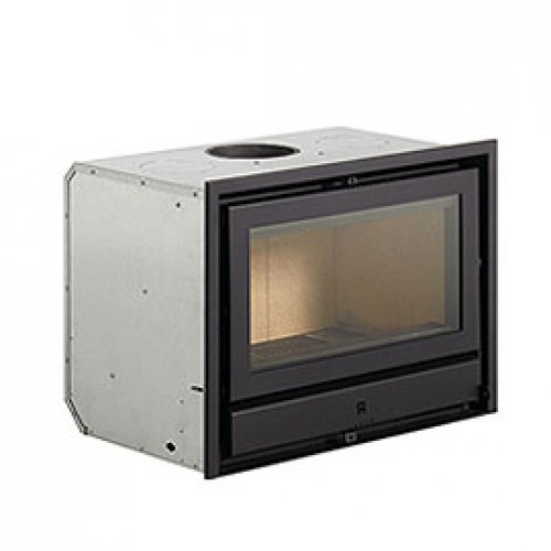 Дровяная топка с прямой стеклянной дверцей. Корпус изготовлен из листовой стали, внутренние стенки очага облицованы вермикулитом. Удобная загрузка топлива, простой уход, экономичный расход дров. На двери установлено жаропрочное стекло, выдерживающее высокую температуру. Выдвижной зольный ящик.