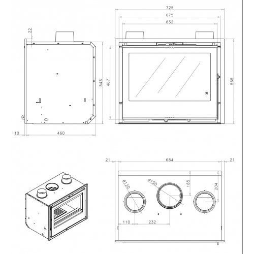 Дровяная топка со стальным корпусом, внутренние стенки из вермикулита. Представленная модель отличается удобной дверцей, которая может открываться как влево, так и вправо. Широкая дверь, большой обзор огня. Дверь оборудована окном из жаропрочного стекла, выдерживающее температуру до +750 градусов. Выдвижной зольный ящик облегчает процесс по уходу за прибором.