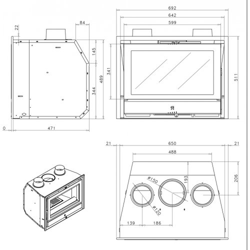 Горизонтальная вставка со стальным корпусом. Стенки очага из специального материала - вермикулита. Дверь открывается в обе стороны - влево и вправо, что позволяет встраивать камеру в любой портал. Данная модель топки оборудована выдвижным зольником.