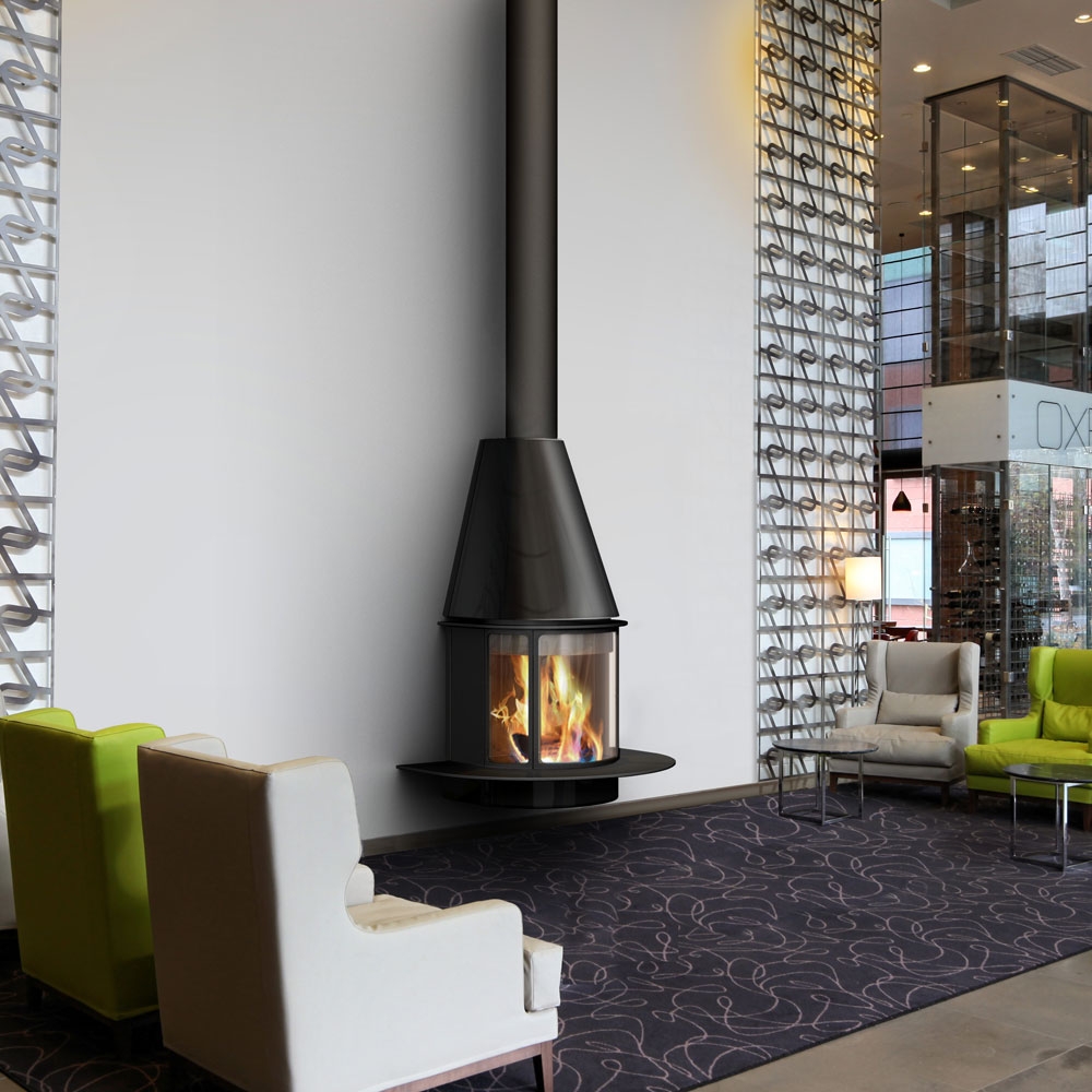 Фронтальный подвесной полукруглый камин с полкруглыми стеклами.