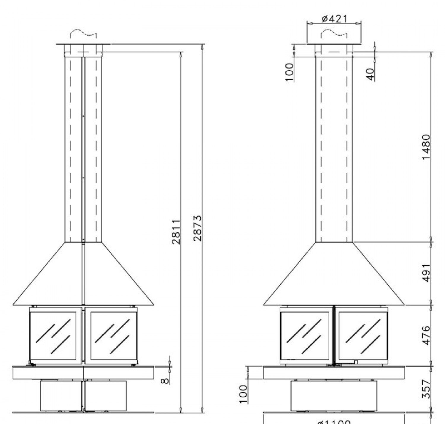 Центральный металлический камин с двойными дверцами. Дрова: 40 см.