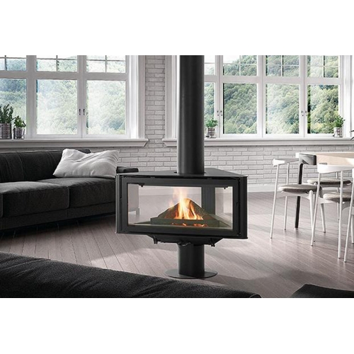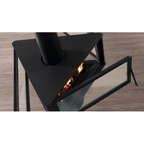 Центральный камин в современном исполнении прекрасно впишется в интерьер загородного дома. Треугольный стальной корпус со стеклянными стенками открывает потрясающую красоту огня со всех сторон. Установленное стекло выдерживает температуру до +750 градусов. Стальной корпус защищен эмалевым покрытием черного цвета.