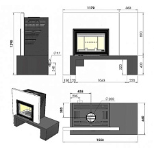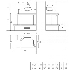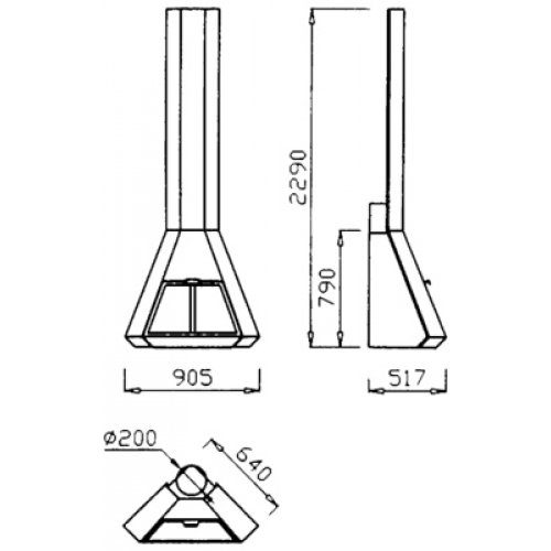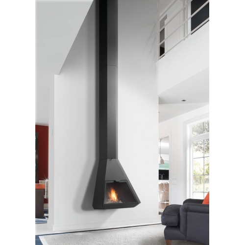 Подвесной камин с креплением к стене. Два варианта расположения: угловое (rincon) или фронтальное (frontal). Оригинальная откидная дверца с жаростойким стеклом. Цвет чёрный или серый антрацит. Изготовлен из специальной марки стали, толщина от 1,5 до 5 мм. Чугунная колосниковая решётка, встроенная шиберная заслонка в трубе. Отапливает посредством теплоизлучения. Опции: подножие для фронтальной модели, дополнительная труба, телескопический элемент для потолка под наклоном, листовое покрытие для пола, набор для приготовления пищи на решётке
