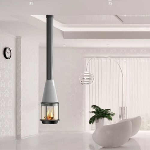 Центральный подвесной цилиндрический камин с максимальным обзором огня.