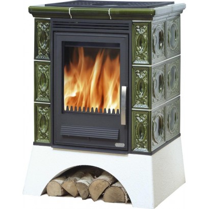 Кафельная печь Helvetia KP белый цоколь, вставка комбо зеленая, с теплообменником
