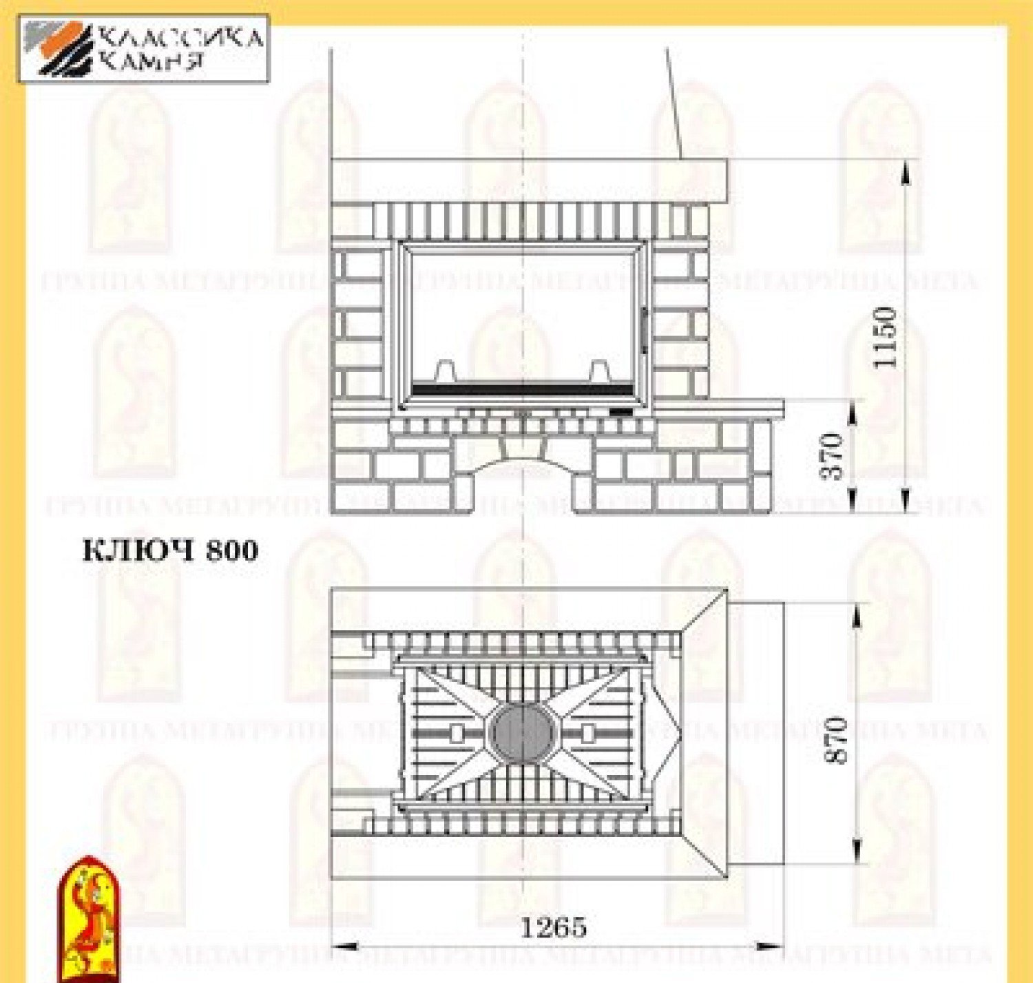 Облицовка Мета КЛЮЧ 800 изготовлена из натурального мрамора теплого бежевого оттенка с обработкой искусственного старения «Антик» в сочетании колотого доломита жёлтого цвета и травертина светло-коричневого цвета. Притопочная и надтопочная часть выполнена из шамота песочно-желтого цвета. Каминная балка, изготовленная из МДФ и шпонированная дубом, послужит отличной полкой для каминных аксессуаров. В нижней части камина расположена удобная ниша для хранения и сушки дров.