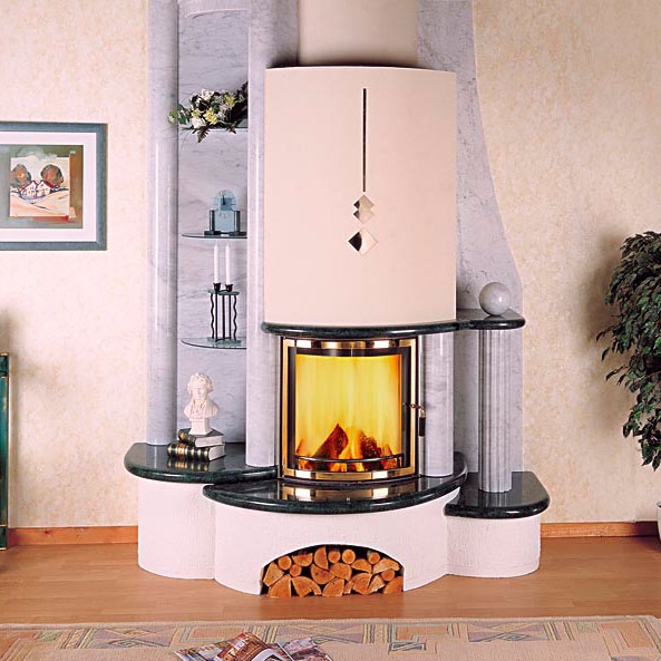 Пристенная облицовка из полированного мрамора Carrara poliert, столешница и каминная полка из полированного темно-зеленого мрамора Guatemala poliert.